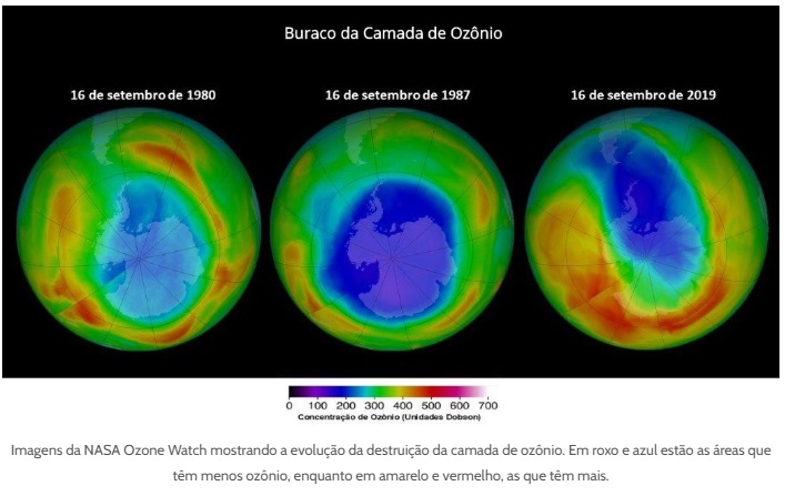 A foto acima mostra a situação inicial em 1979, a situação em 2006, com um buraco enorme indicado pela cor roxa e a situação em 2019, onde é possível ver que a camada está se recompondo, indicado pela cor azul claro.